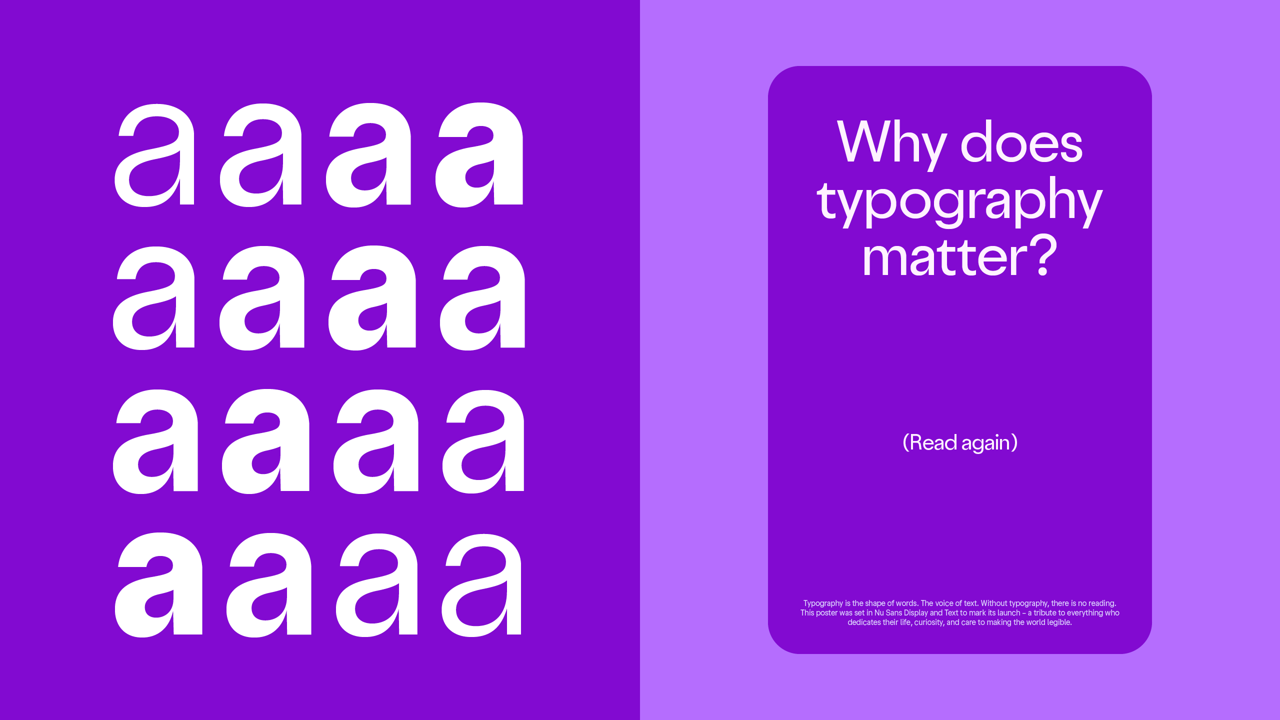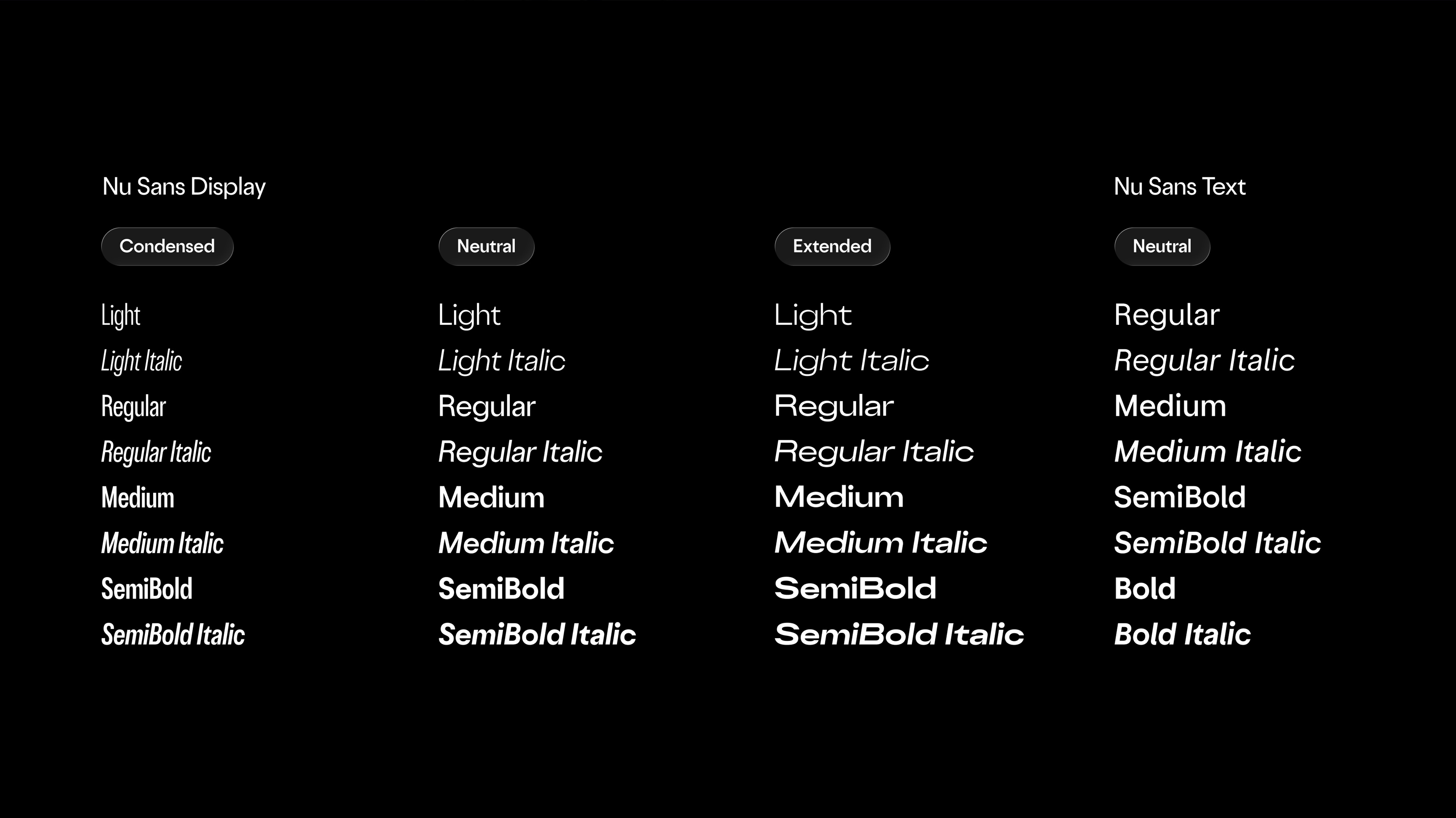 The logo joint was chosen as the inspiration for the font's neutral, timeless look — a direction that brings longevity while anchoring visually to a distinctive brand core element. The typeface family offers three widths, four weights, italics and two optical sizes – Text and Display – in a total of 32 fonts.